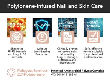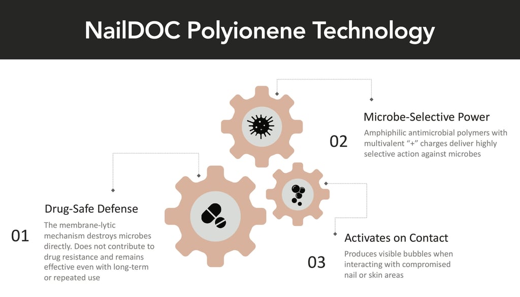 NailDOC Advanced Nail Care Serum is clinically proven to help restore nails affected by fungal concerns, discoloration, brittleness and damage. Powered by Polyquaternium-117 Polyionene, a patented antimicrobial polymer complex, the formula delivers fast and effective action - eliminating 99.9% of bacteria and fungi within 30 seconds. This advanced technology provides broad-spectrum antimicrobial protection while remaining gentle and skin-compatible.